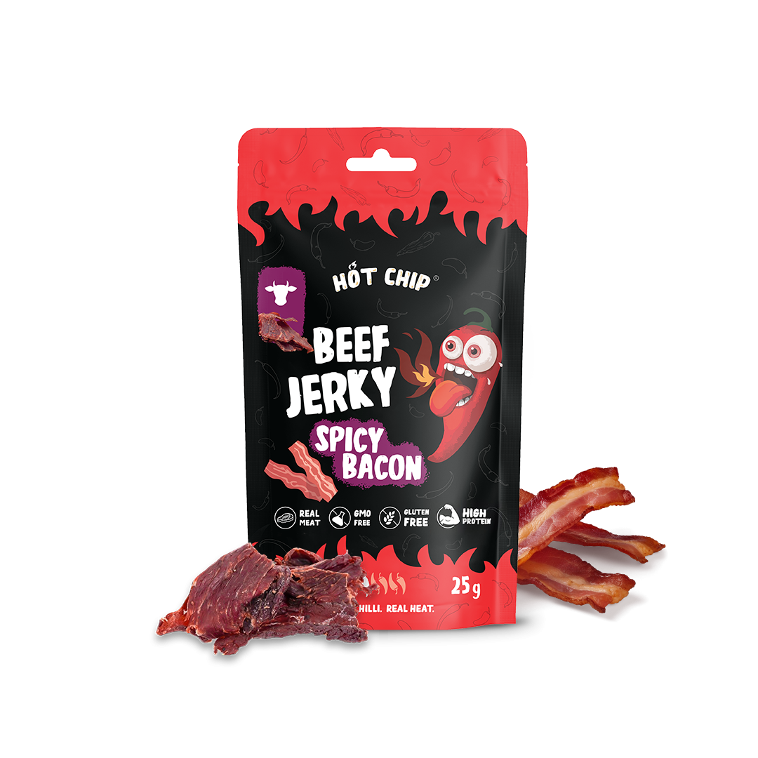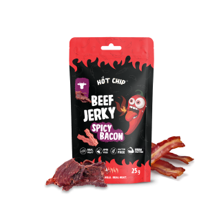 z kategorie HOT CHIPKombinace nejvybranějších ingrediencí Není jerky jako jerky. Spousta výrobců totiž nesází tolik na kvalitu jako spíše na zvýrazňovače chuti a umělé aroma. My ne. Věříme totiž, že v kvalitě a jednoduchosti je krása. Proto v každém balení najdeš to nejjemnější hovězí maso, neodolatelnou chuť slaniny, kouřové aroma a lehce pikantní chilli. Uvidíš, že tahle kombinace odstartuje naprostou chuťovou explozi v tvých ústech. Skvělá svačina pro každého Balení Jerky spicy bacon se vleze do batohu i do kapsy. Můžeš si ho proto vzít na výlet nebo jako svačinu do práce. Výhradně přírodní ingredience a vysoký obsah proteinu zajistí, že tvé tělo dostane, co potřebuje, i když zrovna nemáš čas si uvařit. Pečlivý proces výroby Naše práce nezačíná v okamžik, kdy ochucujeme každý jeden plátek sušeného hovězího. Začíná totiž už při samotném výběru surovin a koření. Můžeš si proto být jistý, že každé balení obsahuje jen prvotřídní hovězí a pečlivě vybranou kombinaci chilli koření. Říkáme NE chemii Všechny pálivé chutě, které se rozezní v tvých ústech, mají přírodní původ. V HOT-CHIP totiž věříme, že v kvalitním jídle není pro zbytečnou chemii žádné místo. Ale to poznáš sám už při prvním soustu!